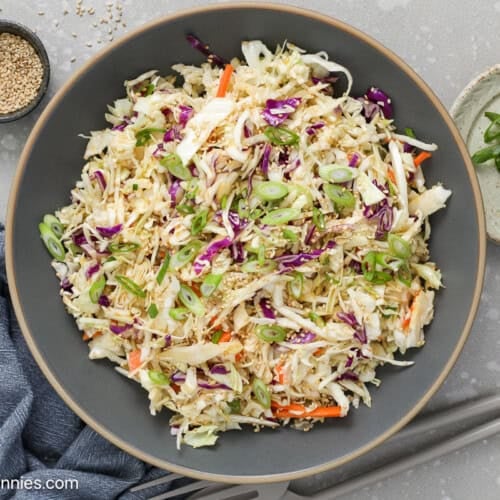 Crisp, colorful, and super easy to make, this Asian Slaw recipe is packed with crunch and flavor. Crisp cabbage in a sesame soy dressing is a quick side dish to serve with grilled chicken, salmon, rice bowls, or stir fry.