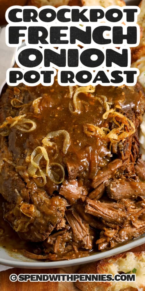 This slow cooker pot roast recipe is full of flavor with tender chuck roast and onions that cook down into a rich savory French onion gravy. We serve it with buttery mashed potatoes and cheesy toasts for an easy dinner that feels special.