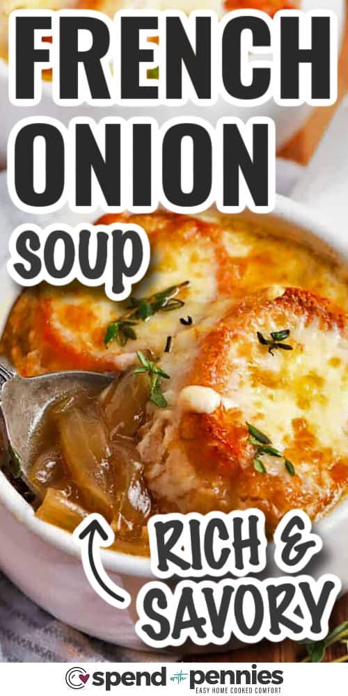 This French onion soup recipe is a bistro-worthy classic. Sweet caramelized onions and herbs are simmered in a rich and savory broth and topped with crispy, cheesy bread.