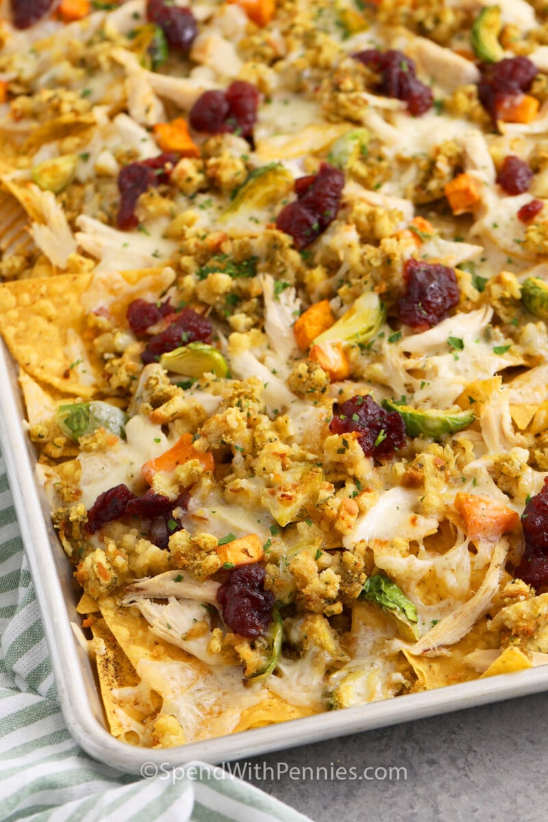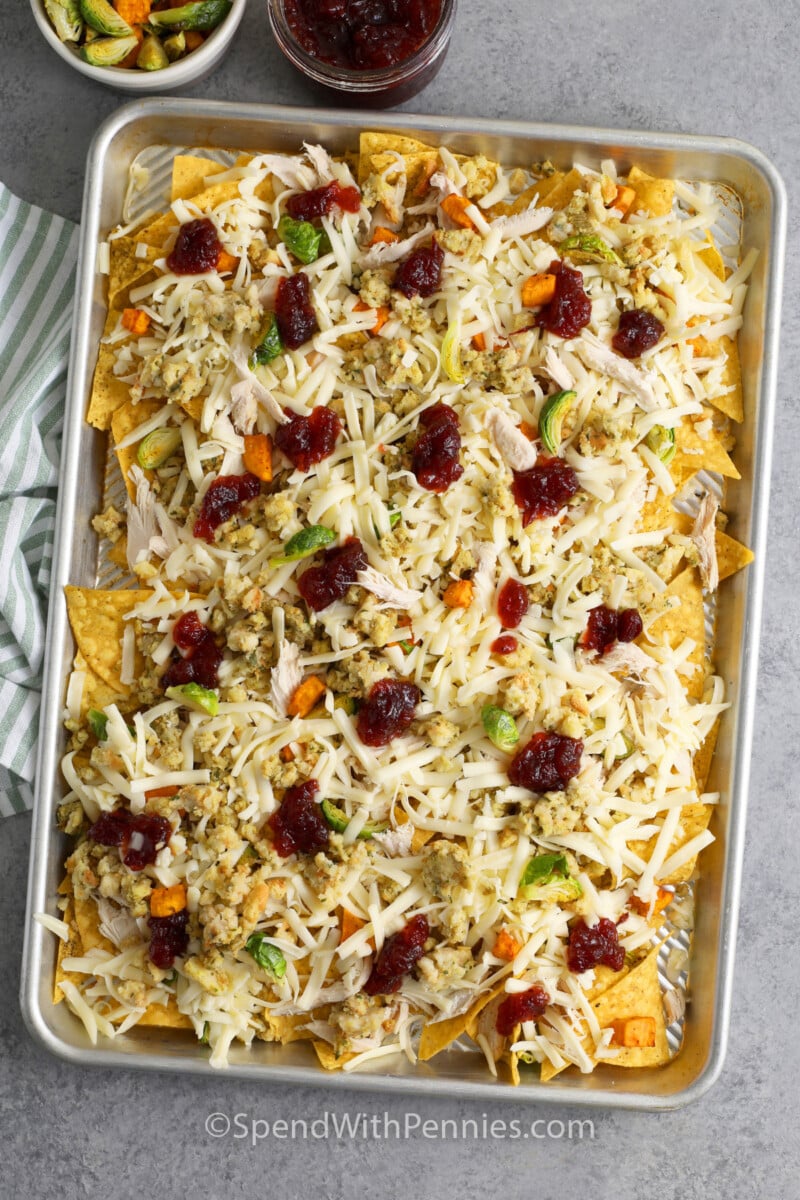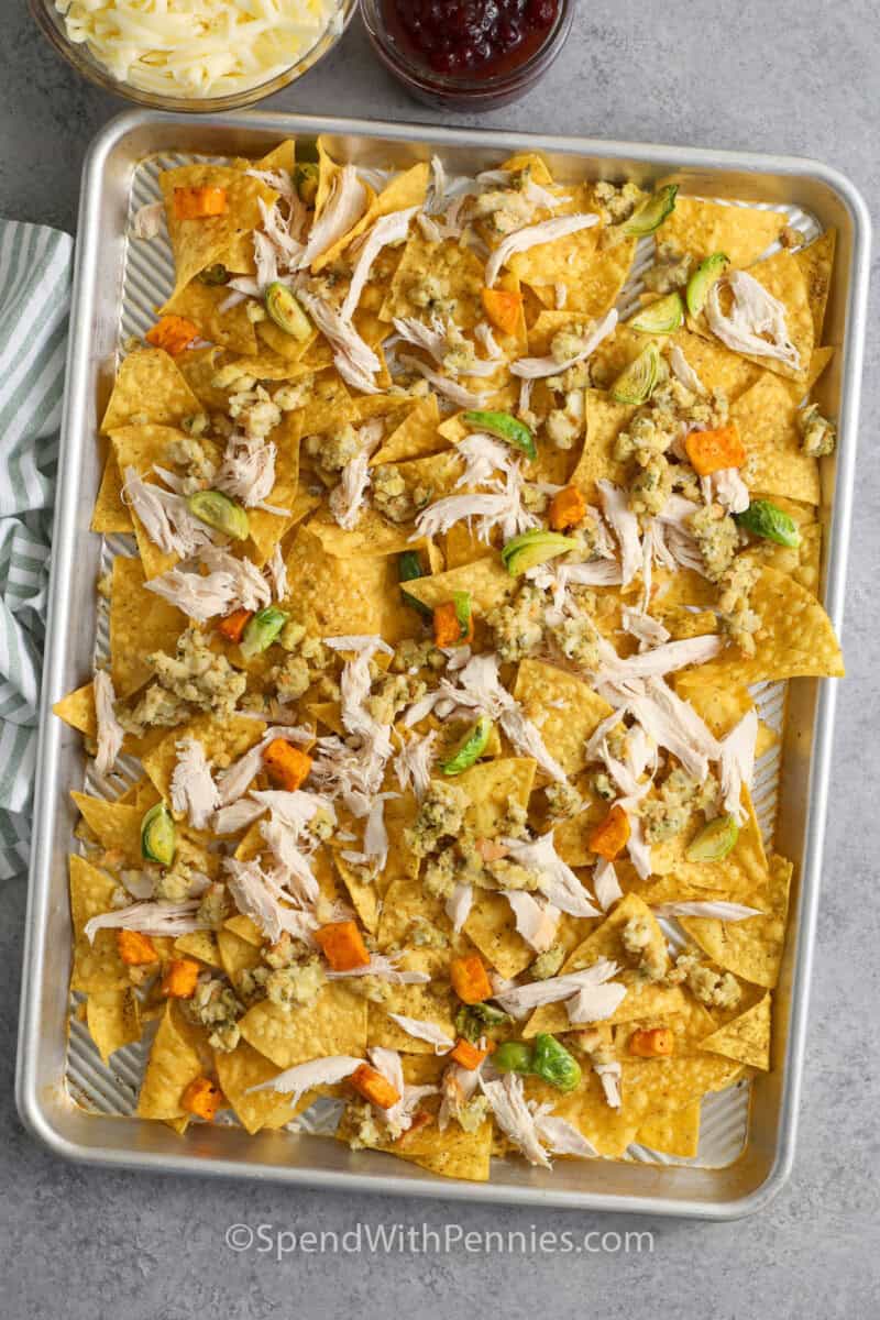 - Chop the vegetables and sprinkle over the turkey. Crumble 1 cup of the stuffing over the nachos.
