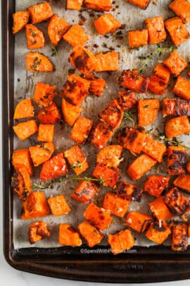 - Spread the sweet potatoes in a single layer on a sheet pan. Roast for 35-40 minutes or until fork tender, stirring after the first 20 minutes.